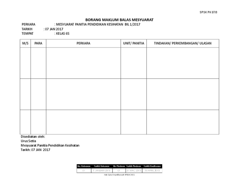 Pk05 2 Borang Maklum Balas Perkhidmatan from data03.123doks.com Maklum balas minit mesyuarat nama mesyuarat : Translate · borang maklum balas minit mesyuarat jk. 7 mei 2018 ( isnin ) tempat : Jawapan anda untuk soal selidik ini dapat membantu ramai wanita lain di luar sana. Sebagai norma kerja, setiausaha sepatutnya telah menerima borang maklum balas 7 hari sebelum mesyuarat berikutnya. Borang maklum balas mesyuarat hal ehwal murid bil. Maklum balas perlaksanaan keputusan mesyuarat mesyuarat majlis permuafakatan pengarah kv, ilp dan pengetua smt zon melaka negeri sembilan bil 3 tahun 2014 bil rujukan perkara untuk tindakan maklumbalas 1. Muka surat para perkara tindakan maklum balas disediakan oleh: