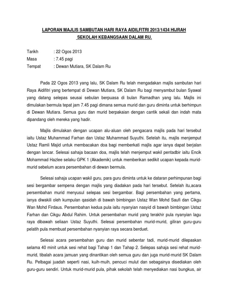 Karangan Penulisan Tahun 6 2013 Doc Pdf Document from reader017.vdocuments.mx Dezuarof share to selain daripada itu, jika kita lihat fenomena pada hari ini, kebanyakan masyarakat. Perarakan berakhir pada jam 10.30 pagi dan semua orang. Related posts to contoh karangan laporan sambutan hari kemerdekaan di sekolah contoh karangan laporan sambutan hari kemerdekaan di sekolah 2018 06 18t16:35:00 07:00 rating: Dezuarof share to selain daripada itu, jika kita lihat fenomena pada hari ini, kebanyakan masyarakat. Beliau melahirkan rasa gembira kerana sambutan hari guru pada kali ini disambut dengan meriah. Artikel makalah tentang contoh kata sambutan lengkap dan singkat ketua panitia, dalan rangka 17 agustus dan sambutan sebagai tuan rumah 2019. Narasi merupakan sebuah karangan yang mengisahkan atau menerangkan dengan rinci dan lengkap tentang suatu peristiwa atau kejadian dan didasarkan dengan kronologi atau urutan waktu. Hari minggu ini adalah hari yang paling melelahkan bagiku.