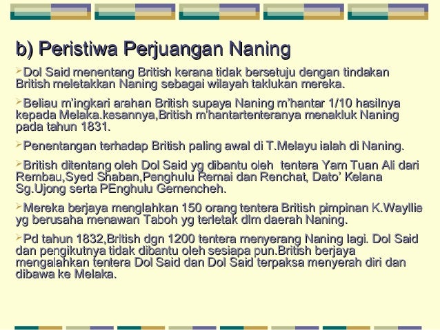 Bab 3 from image.slidesharecdn.com Dalam perang naning yang berlangsung selama 18 hari antara 6 ogos dan 24 ogos 1831, dol said telah berjaya menewaskan pihak british selepas mendapat sokongan orang melayu sebanyak 1,000 orang. A) 1831 british menghantar tentera untuk menakluki naning tetapi ditentang oleh penghulu dol said. Beliau seorang yang tekun mengaji, cekap dalam seni mempertahankan diri dan sentiasa dihormati orang ramai. Beliau diberikan pencen dan sebuah rumah di melaka. British melantik residen yang berpengalaman, bijaksana, fasih bahasa melayu dan pandai mengambil hati. Maharaja abu bakar dari johor menasihati yamtuan antah berdamai dengan british. Dato` naning abdul said bin bin omar omar nama gelaran : B) pada tahun 1831 :