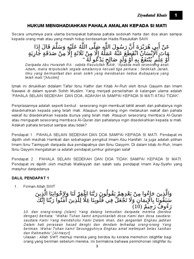 Apabila mati seseorang anak adam itu, maka terputuslah segala amalannya kecuali tiga perkara : Sedekah yang berlaku terus menerus, pengetahuan yang d manfaatkan, dan anak sholeh yang mendoakan dia. (hr muslim). Kecuali tiga perkara, shodaqoh jariyah, ilmu yang bermanfaat dan anak yang sholeh yang mau mendo'akan kedua orangtuanya. disinilah kita harus menunjukkan bakti kita yang terakhir apabila orangtua kita meninggal. Apabila 'anak adam itu mati, maka terputuslah amalnya, kecuali (amal) dari tiga ini Tahun 1087 m, sekelompok pelaut yang.